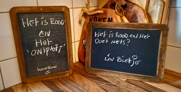 In eenkoop deze gave schoolleitjes. Met houten rand en het riekt naar nostalgie. Ongeveer 20x30 cm. Leuk om voor uw liefde een boodschap achter te laten of wijze spreuken te doen herleven... te leuk 😉